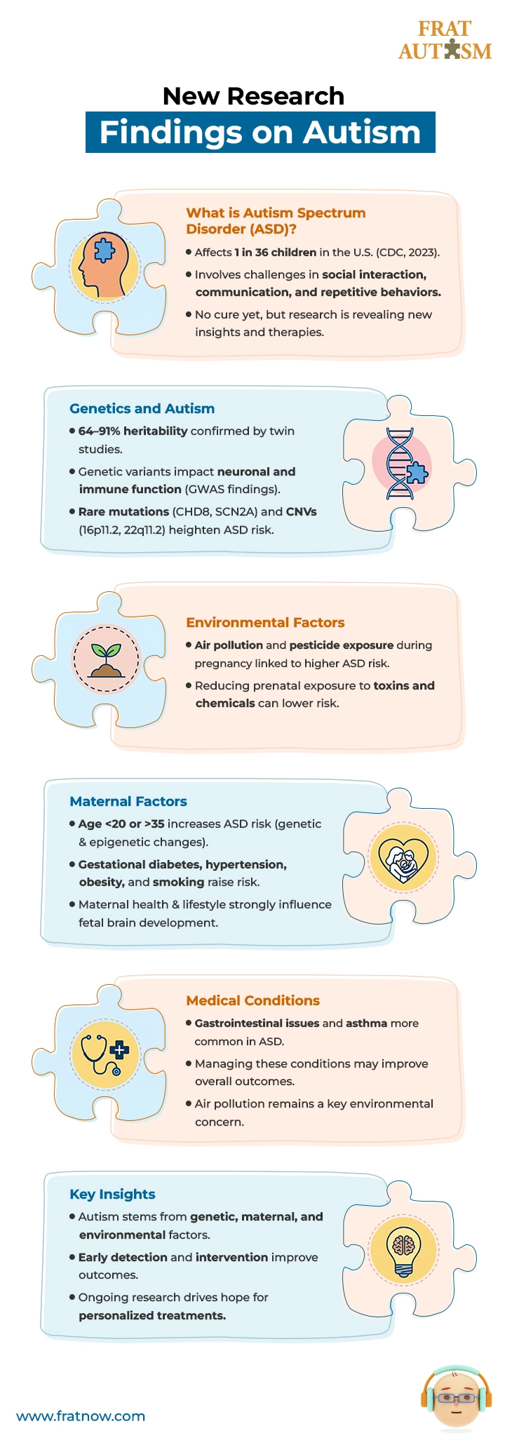 One of the most significant findings in ASD research is the high heritability of the disorder. Twin studies have consistently shown that ASD has a strong genetic component, with heritability estimates ranging from 64% to 91% (Hallmayer et al., 2011, Tick et al., 2016). Several large-scale genome-wide association studies (GWAS) have identified multiple common genetic variants associated with ASD, including variants in genes involved in neuronal development, synapse formation, and immune system function (Gaugler et al, 2014, Grove et al 2019)